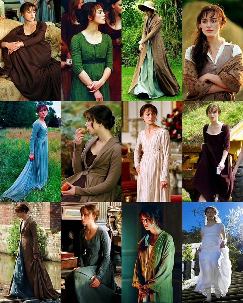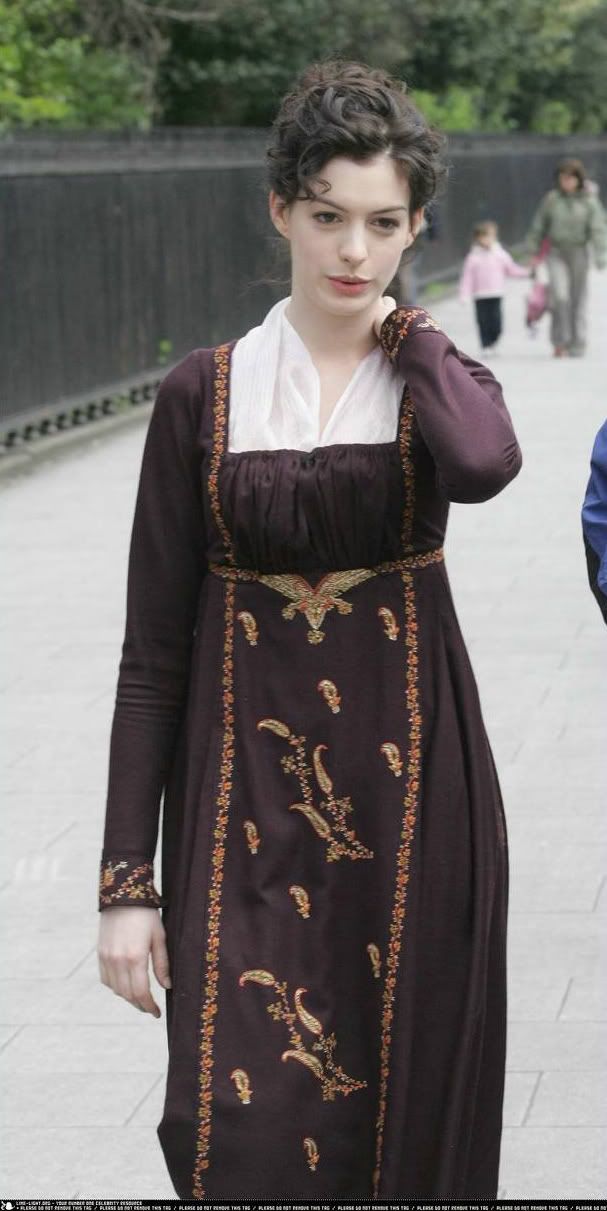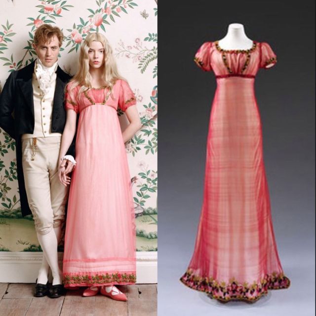 略有希臘羅馬風格的直筒線條,高腰(一般在胸部下方),剛開始以薄棉料為主,後來才漸有絲綢料,並且加上披肩、短外套(斯賓塞短上衣 Spencer Jacket)、長大衣(Pelisse) 用以防寒,畢竟英國當時的溫度比現在還低呢!因為運用了絲綢料,當然服裝的設計也花俏起來,還會加上小小的手網提袋以及寬帽沿露出前額的軟帽,為整體裝扮加分。這就是我們追劇時常看到女角們的服裝風格,在洛可可與浪漫主義風格的包抄下,帝國風格真的別有特色。