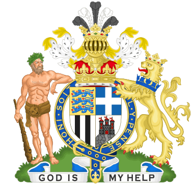 中間的盾:左上、左下、右上、右下分別代表丹麥、巴滕貝格或蒙巴頓、希臘、愛丁堡;盾後環帶的古法語字:心懷邪念者蒙羞;底為格言「上帝助我」。(維基百科)
