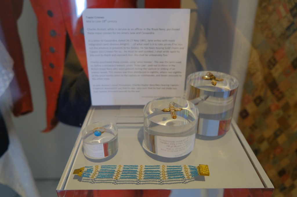 身為一個牧師之女兼女作家,目前她留下的首飾真的不多,有一個黃水晶十字架項鏈、綠松石手鍊,以及一個綠松石戒指。這些一直保存在家族手中,其中這個戒指在珍‧奧斯汀死後留給她的姐姐卡珊卓拉,最後到她的姪女卡洛琳手上,不過後來不知道什麼原因,這個戒指在拍賣會現身,令人驚訝!
